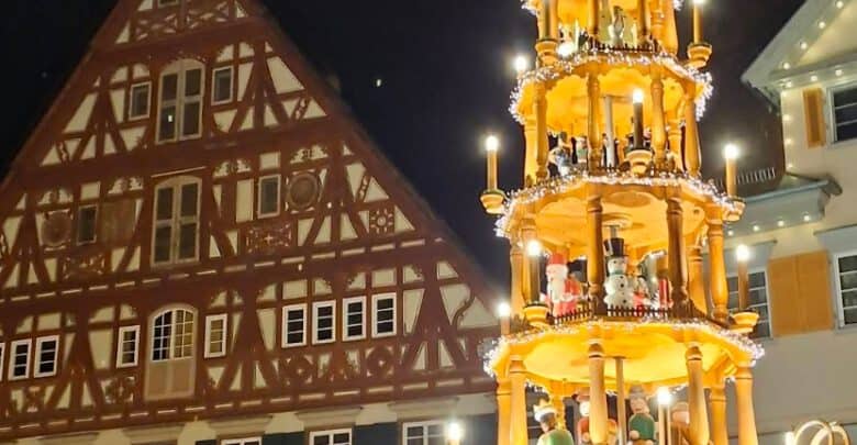 Die große Weihnachtspyramide vor der Stadtkirche St. Dionys – ein beliebtes Fotomotiv auf dem Esslinger Weihnachtsmarkt.
